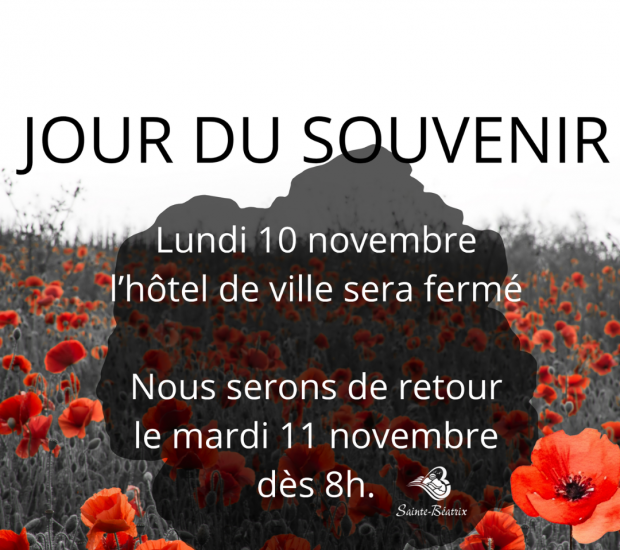 En raison du jour du Souvenir, l'hôtel de ville sera fermé le lundi 10 novembre.